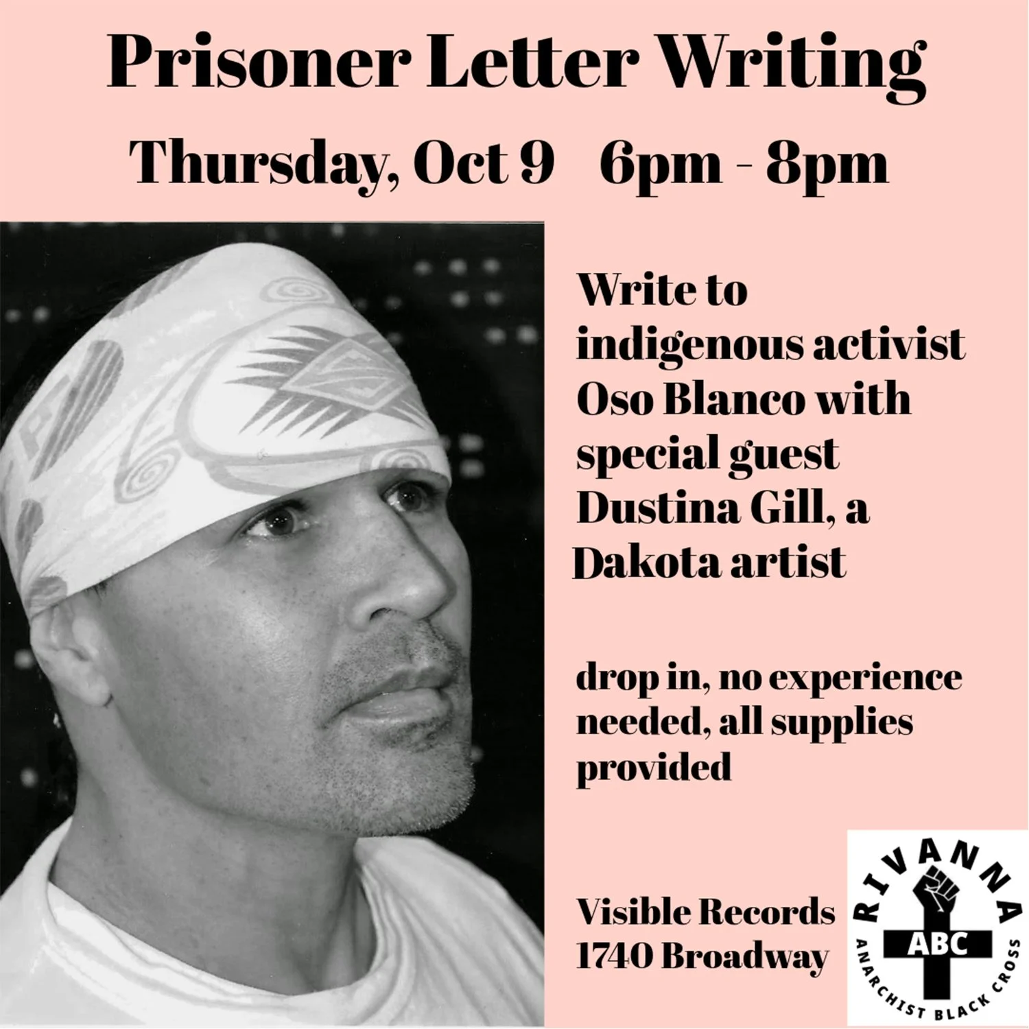 This month we'll be writing to Oso Blanco, an indigenous activist serving 55 years. Oso is an enrolled citizen by blood of the Cherokee Nation. We'll be joined this month by Dakota artist, Dustina Gill. Dustina will be hosting a workshop at Visible Records earlier in the day to make prayer bags.