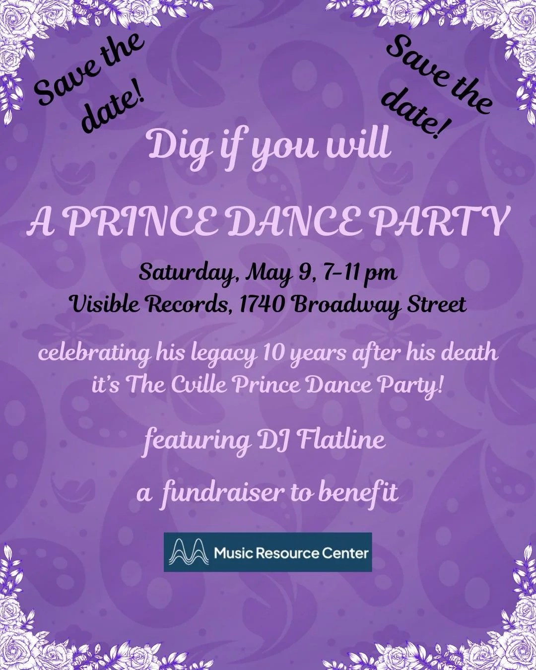 Prince Dance Party, organized by a small group of Prince-fans and social justice-minded folks in Charlottesville, to mark the 10th anniversary of his death (April 21) and raise money for two local non-profits, the Music Resource Center and Computers 4 Kids. Connecting marginalized kids with music and technology were philanthropic efforts close to Prince's heart.
