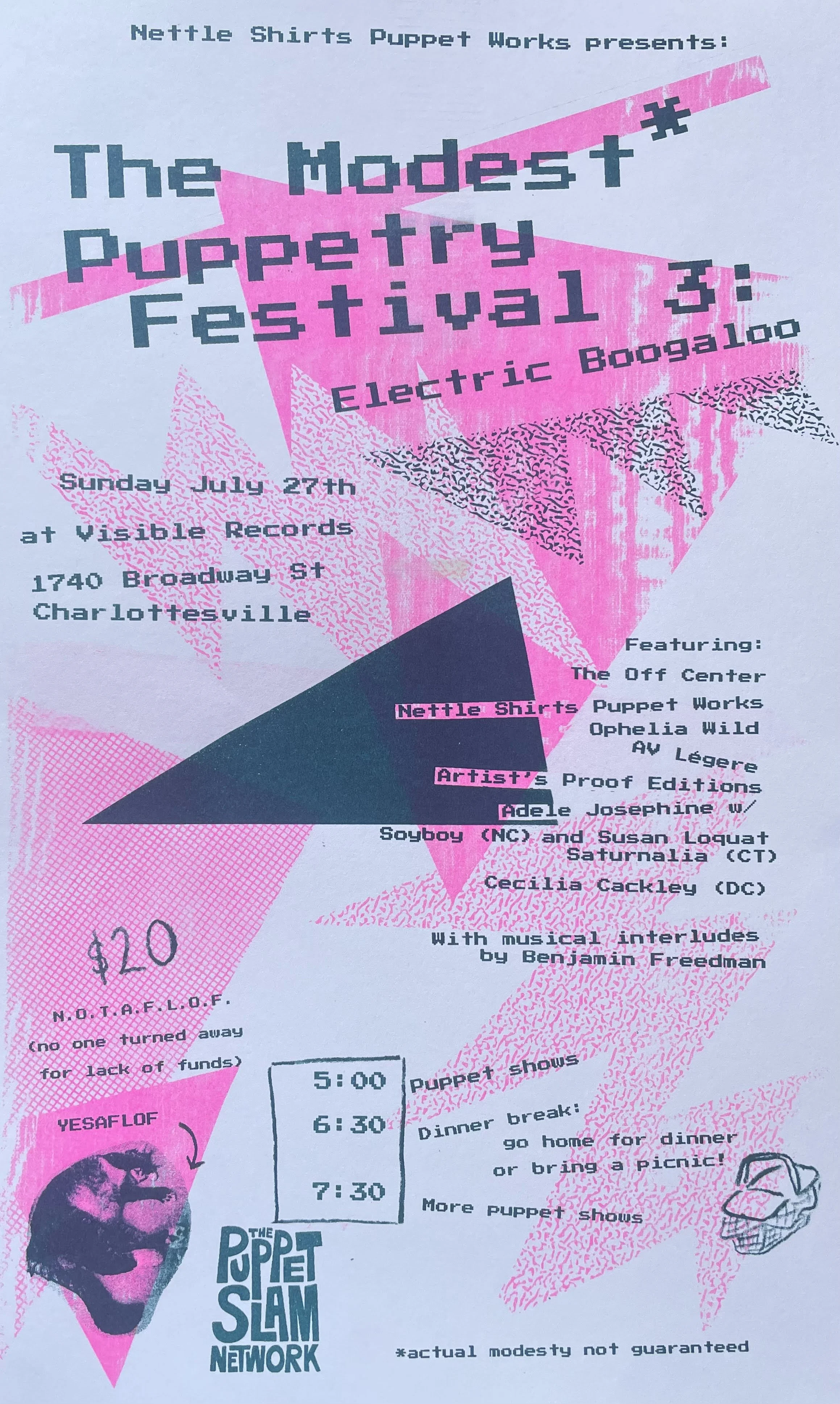 Come check out local artists performing puppetry for adults across a wide range of styles from shadows to felt to cardboard! This year's Modest Puppetry Festival will feature "Sir Gawain and the Green Knight" performed with hilarious musical accompaniment by Staunton's own The Off Center! There will be new short performances by Charlottesville artists Ophelia Wild, AV Legere, Artist's Proof Editions, Adele Josephine with Soyboy and Susan Loquat, and Nettle Shirts Puppet Works. Between shows will be musical interludes by Benjamin Freedman, plus a tiny puppet show in a box for one viewer at a time from DC artist Cecilia Cackley. And you can make puppets yourself at Cecilia's "Tiny Worlds" puppetry workshop at the Scrappy Elephant (scrappyelephant.com/classes) the Saturday before the festival! *note: actual modesty is not guaranteed.